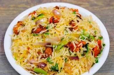 Fried rice mixed with crispy gobi pieces, vegetables, and sauces, offering a spicy and flavorful